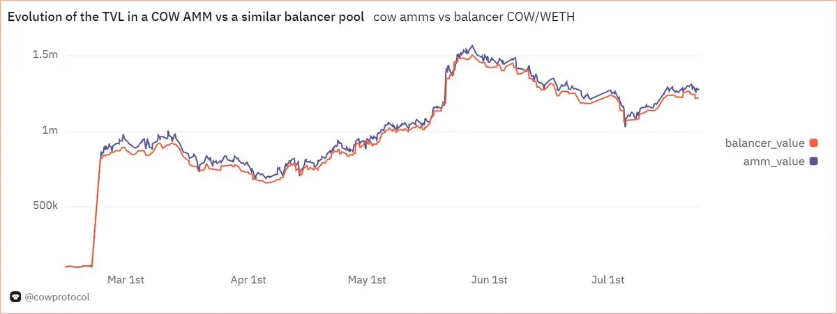通过这一机制,CoW AMM 能够内部捕获现有 CPMM 中 MEV 机器人提取的套利收益,消除 LP 所面临的 LVR 风险,同时 LP 将获得盈余作为提供流动性的激励。换句话说,与现有的 CPMM 不同,CoW AMM 可以将 MEV 作为收入来源,而不仅仅依赖于交易费用。
