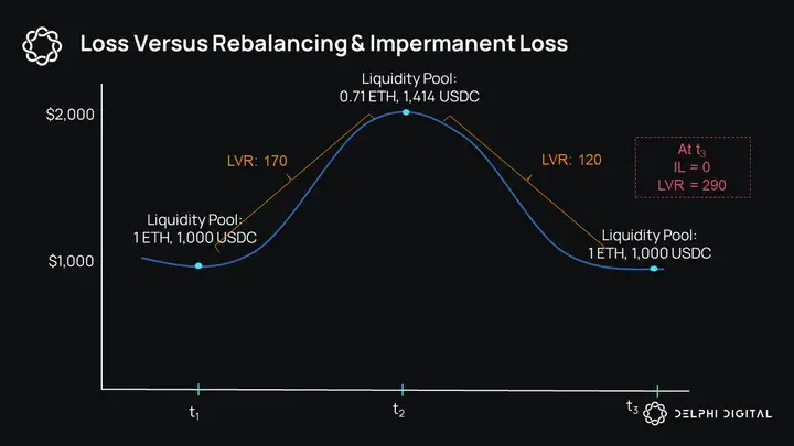 在这里,LVR(损失与再平衡)是一种风险管理指标,量化了 LP 因为资产价格波动而在 LP 状态下由于 AMM 内部资产价格与外部市场价格之间的差异而产生的损失。换句话说,尽管无常损失是流动性提供的另一种风险,仅考虑 LP 由于资产价格波动而可能经历的机会成本,LVR 则代表 LP 在整个 LP 期间承担套利者对手方角色的持续成本。对此需要更详细的解释,但这里需要强调的根本问题是,流动性提供者受到外部套利者的不利交易条件的影响。