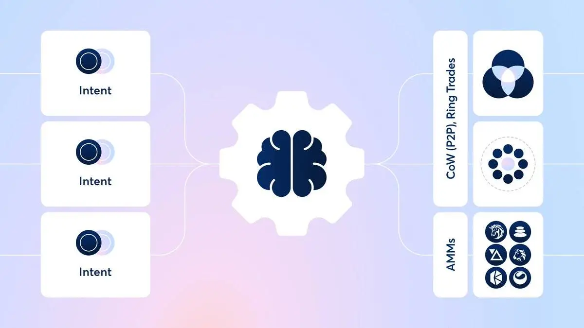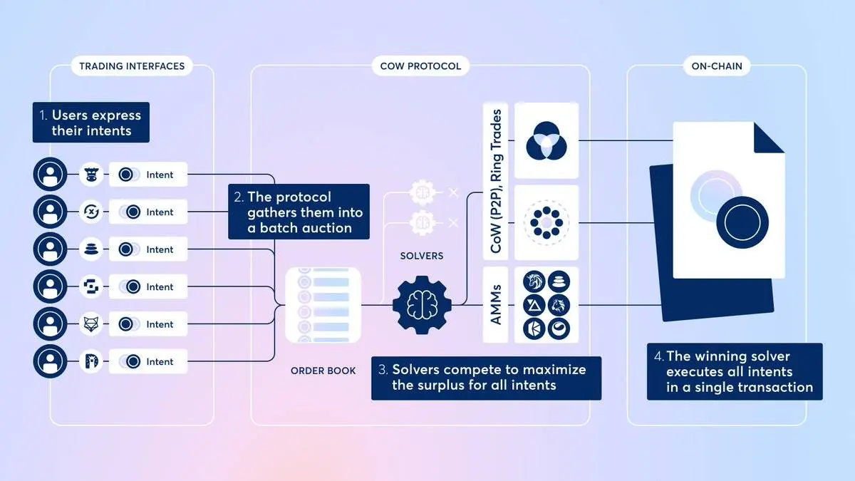 CoW Swap 提供了一种交换服务,通过离线批量拍卖系统保护交易者免受 MEV 攻击,例如前置交易、后置交易或夹击攻击。在 CoW Swap 中,交易者不是直接在链上结算交易,而是将交易代币的意图提交给协议。当这些交易者的交易被打包成一个离线批次时,第三方实体称为 Solver,会寻找来自 AMM(例如 Uniswap、Balancer)和 DEX 聚合器(例如 1inch)等的最佳交易路径。这使得交易者能够免受 MEV 的影响,并以最佳价格进行交易。