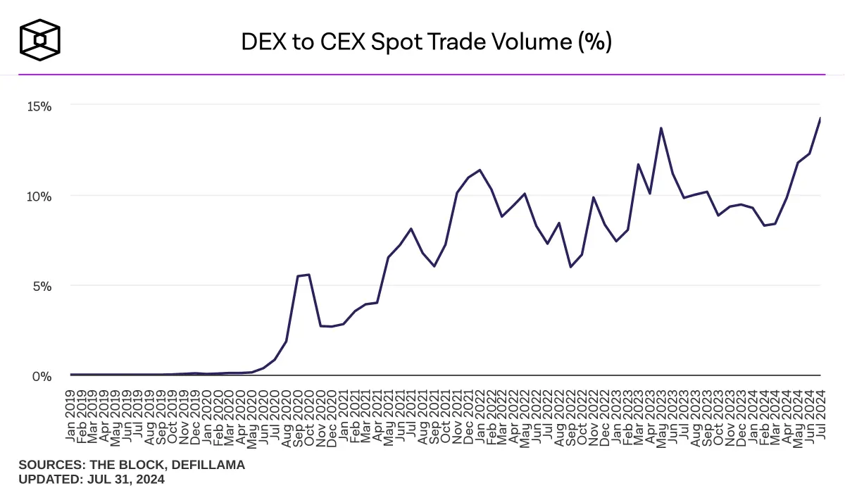 无论短期市场情绪如何不确定,去中心化交易所(DEX)的近期活动让我们对区块链或链上生态系统的长期未来保持乐观。目前,DEX 的交易量达到了自区块链诞生以来的最高水平。根据 The Block 的数据,截至 2024 年 8 月,DEX 的现货交易量约占中心化交易所(CEX)的 14%,而根据 DeFilama 的数据显示,过去 24 小时内通过 DEX 执行的交易额约为 70 亿美元。