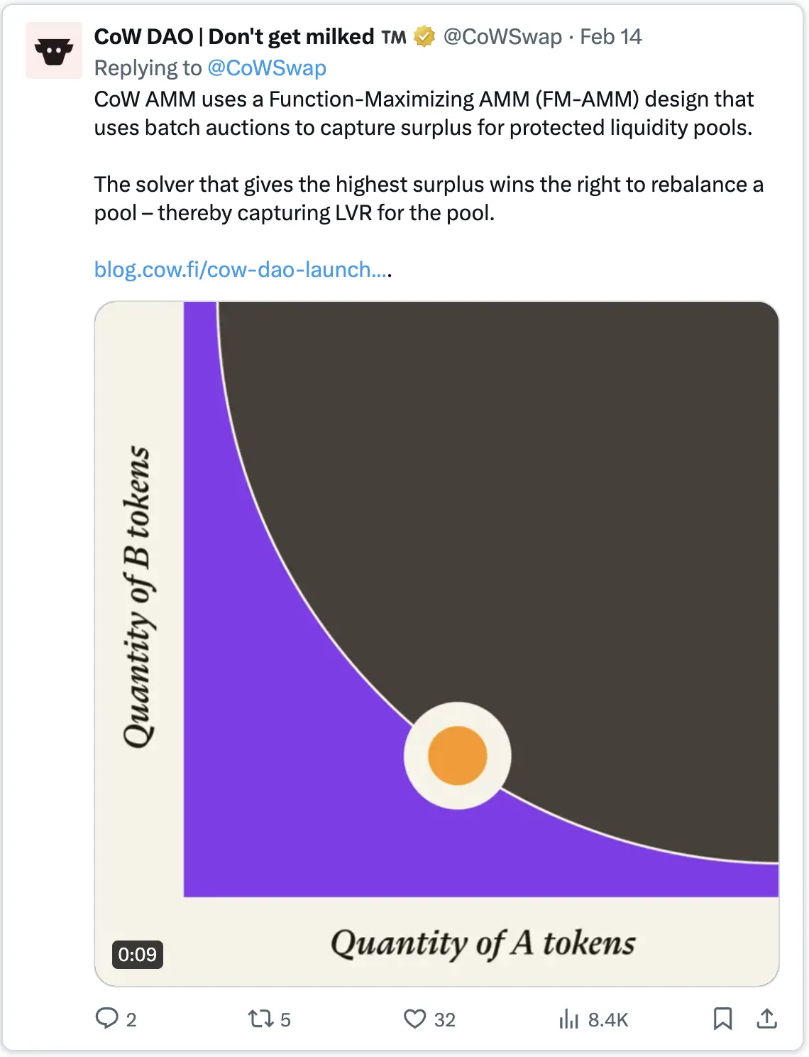 CoW DAO | Don't get milked:CoW AMM 使用功能最大化 AMM(FM-AMM)设计,利用批量拍卖为受保护的流动性池捕获盈余。提供最高盈余的求解者赢得重新平衡池的权利,从而为池捕获 LVR。