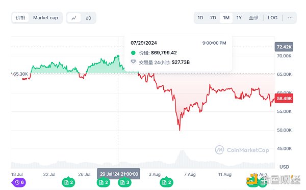 受7月13日特朗普遇刺后支持率上升影响,加密市场迎来一波上涨,BTC约从57500美元涨至68500美元。尤其是特朗普在比特币大会上的讲话,更是让BTC重返70000美元区间。