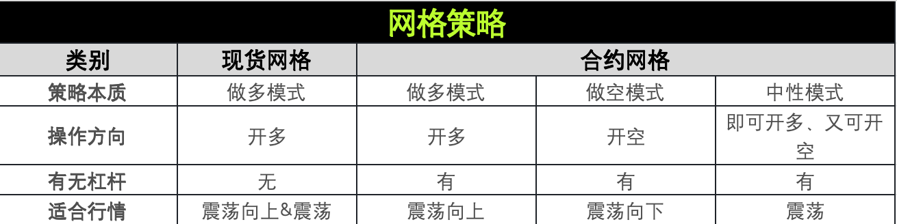 3)合约网格策略支持三种交易策略看多、看多和中性,现货网格策略只支持单向交易。