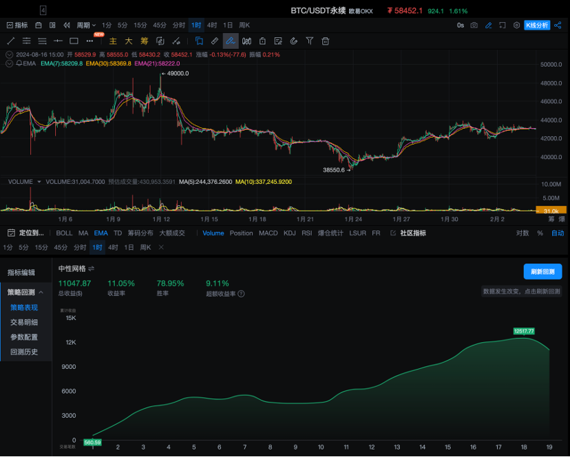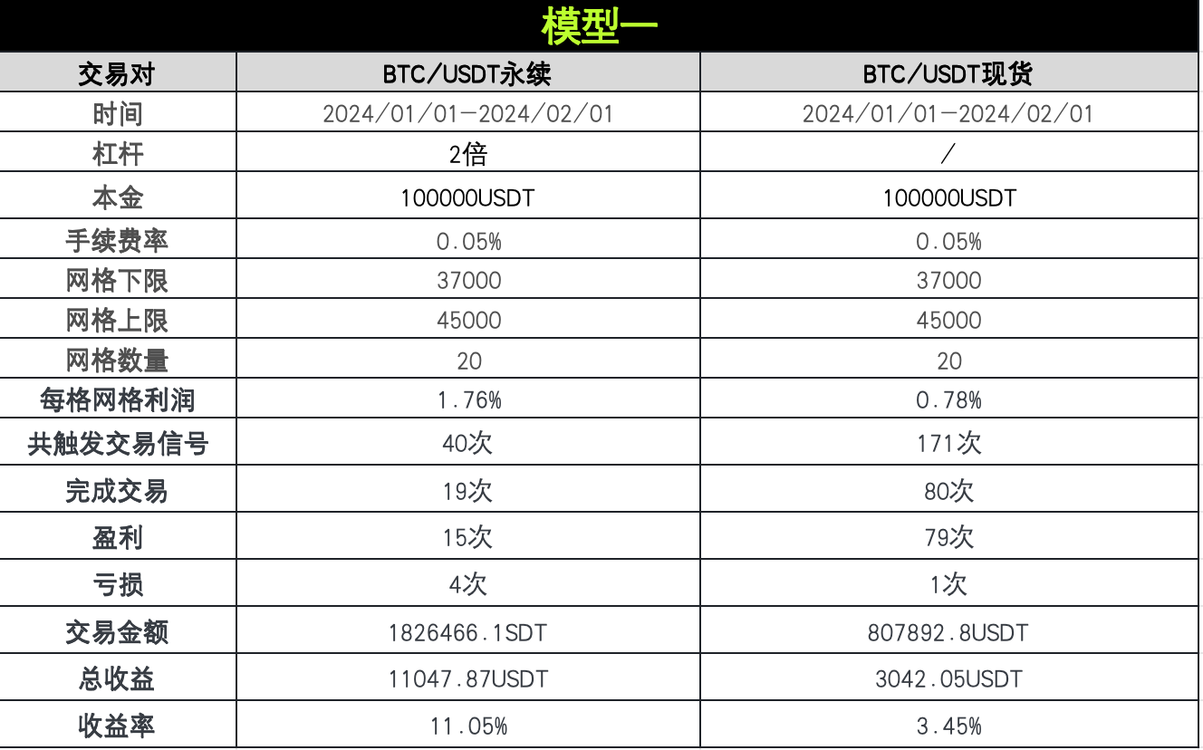 该模型为:横盘震荡 1h 运行周期下的中性合约网格与现货网格