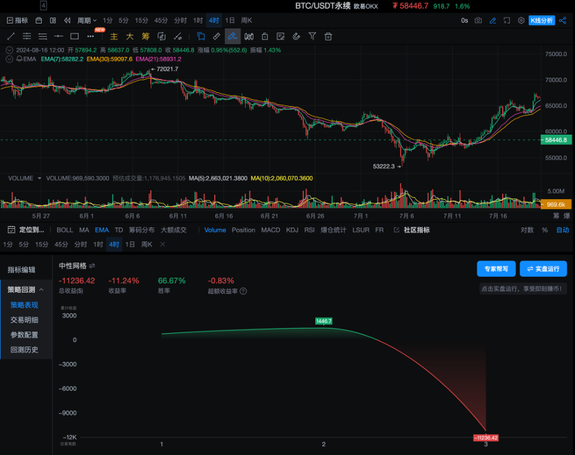 该模型为:震荡向下 4h 运行周期下的中性合约网格与现货网格