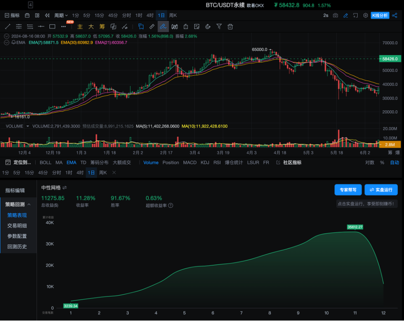 该模型为:震荡向上 1 日运行周期下的中性合约网格与现货网格