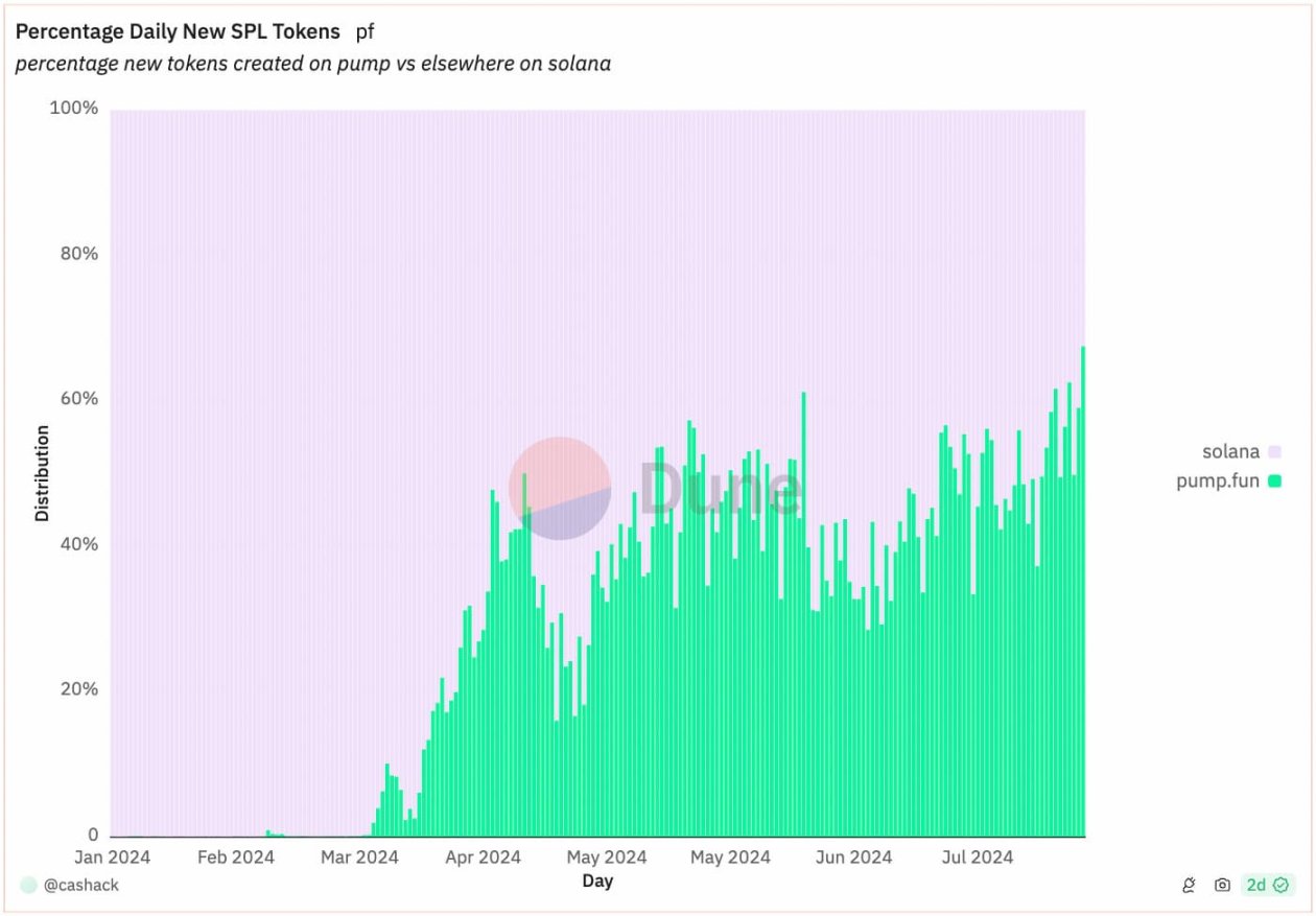 下图是通过 pump.fun 平台创建的新代币与 Solana 网络上其他新创建代币的比例变化。可以观察到,pump.fun 部署新代币的占比呈现稳步上升趋势,近几日已达到 6:4 的比例。