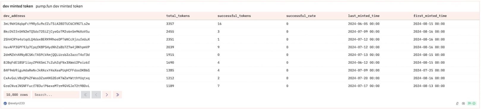 此外,在 pump.fun 部署代币最多的开发者创建高达 3357 个代币,但仅有 16 个代币成功「毕业」,共有 10 个开发者地址创建了超过 1000 个代币,其中创建代币总数第五名的地址共创建了 1915 个代币,但无一「毕业」。