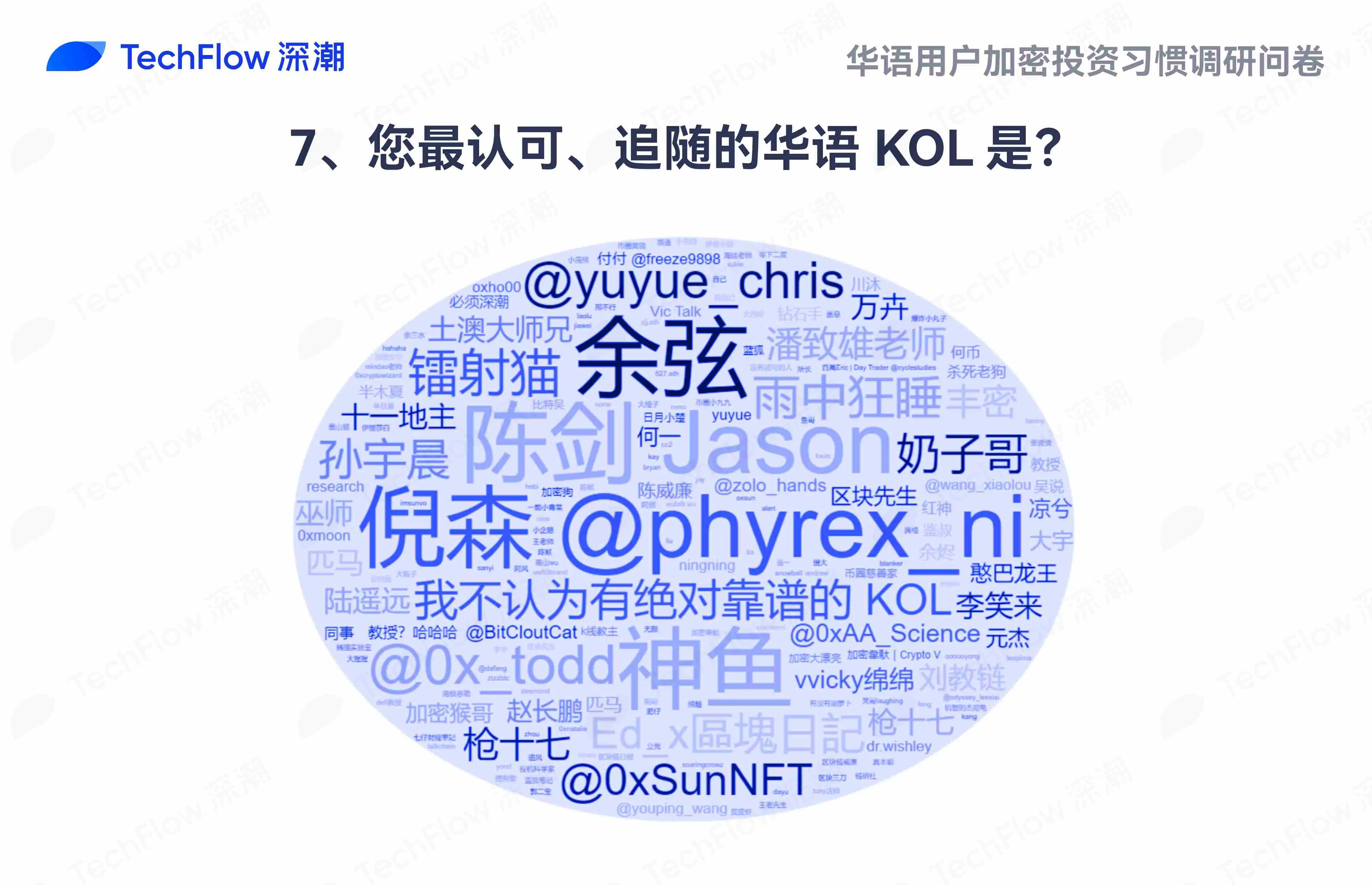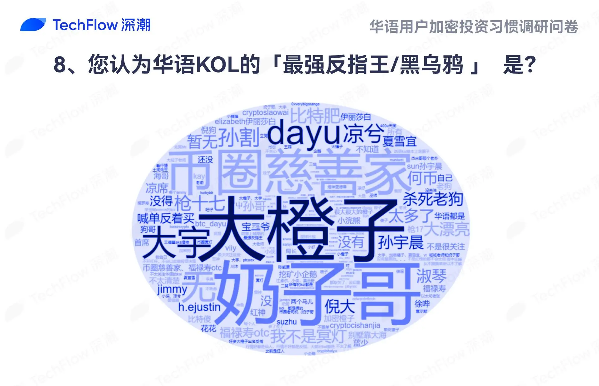 本次问卷调研中,我们对当前受访者最认可的加密 KOL 进行了数据收集,本题为非必答题,感兴趣的受访者可以填写提交,根据反馈中各 KOL 的提及频率,我们制作了词云展示。