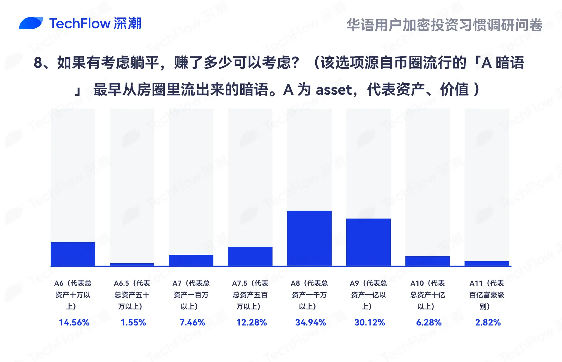 对于是否「赚够就跑」,大多数受访者持否定态度并视 Web3 为信仰。而对于「赚多少才能躺平」问题,超过三分之二的受访者认为需要达到一千万以上的总资产,A8是一个财富分水岭。