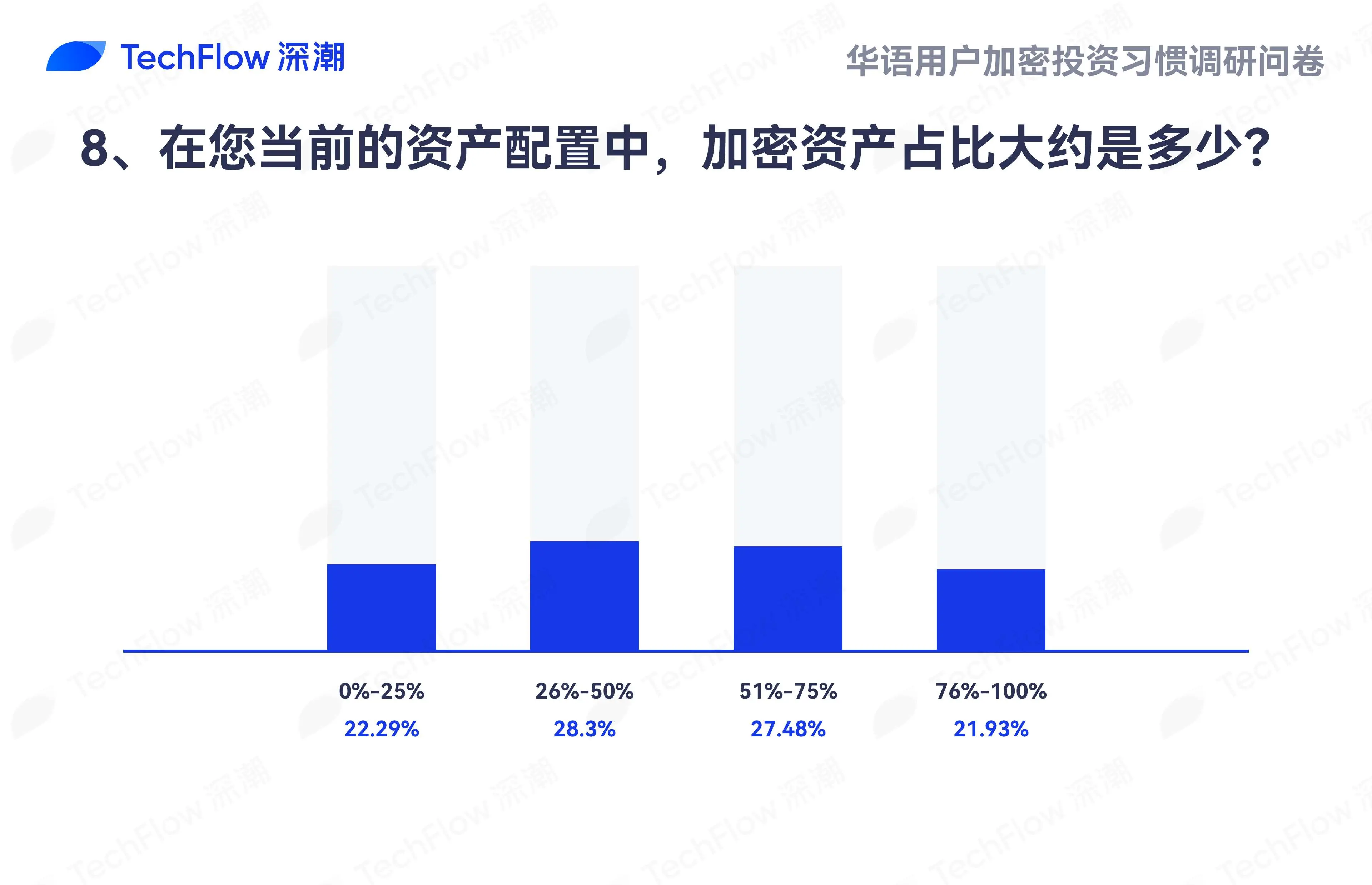 在本次问卷调研中,我们对受访者当前的加密资产配置情况进行了详细统计,数据显示受访者在加密资产的投资比例上呈现出较为均衡的分布特点,这反映了受访者在加密市场中不同的风险管理意识。