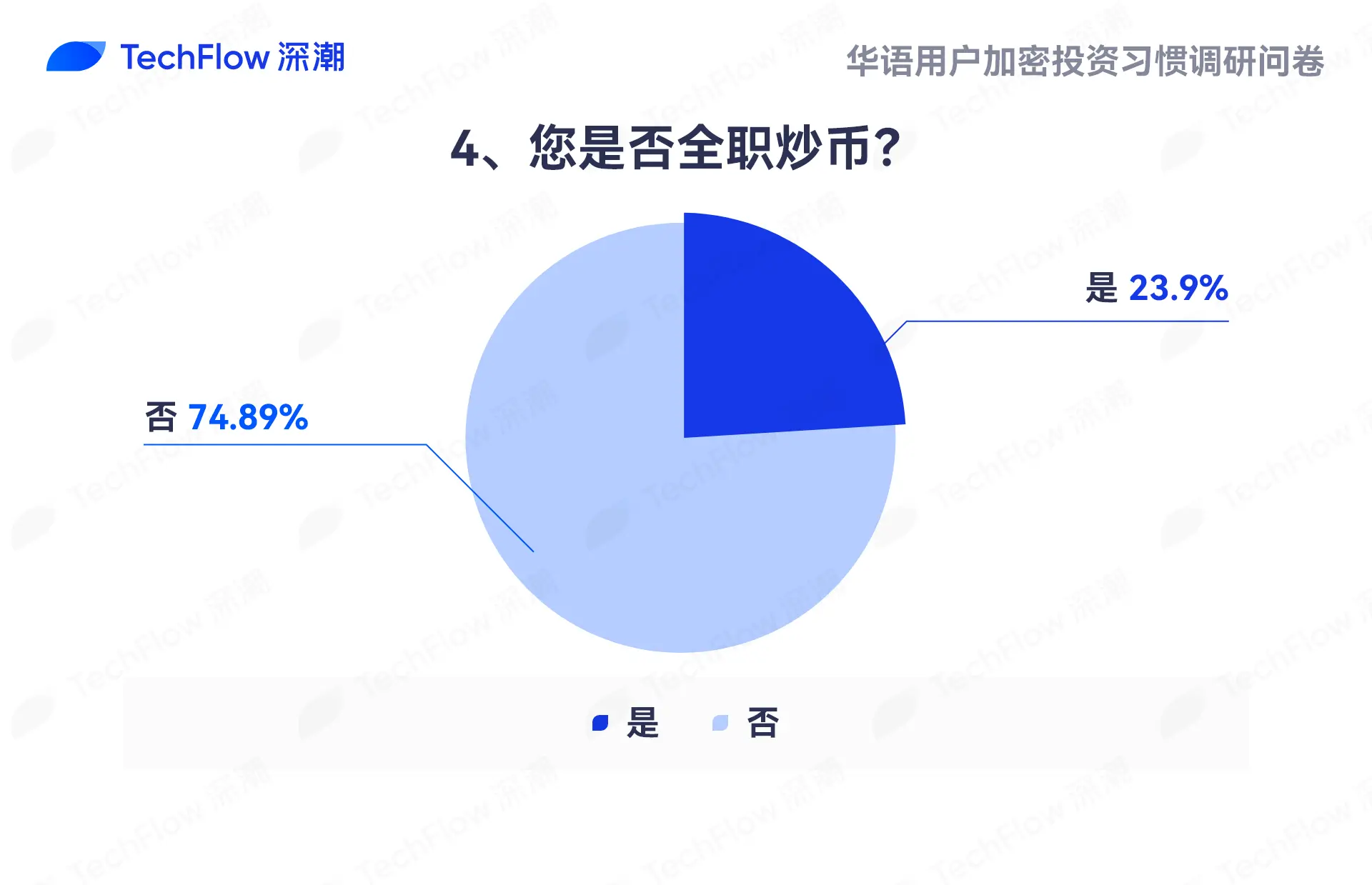 具体而言:全职炒币的受访者占比为 25.11%。即有四分之一的受访者将加密货币投资作为主要职业和收入来源。