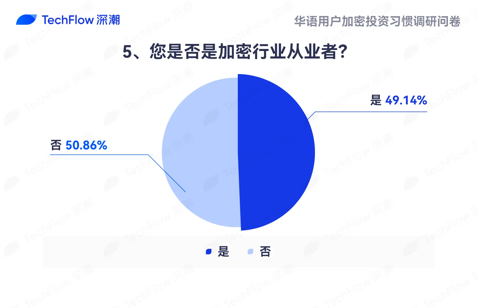 具体而言:49.14% 的受访者是加密行业的从业者,这意味着接近一半的受访者深度参与加密行业。另外 50.86% 的受访者并非加密行业的从业者,更多地扮演投资者或爱好者的角色,关注加密货币的投资机会和市场动态。