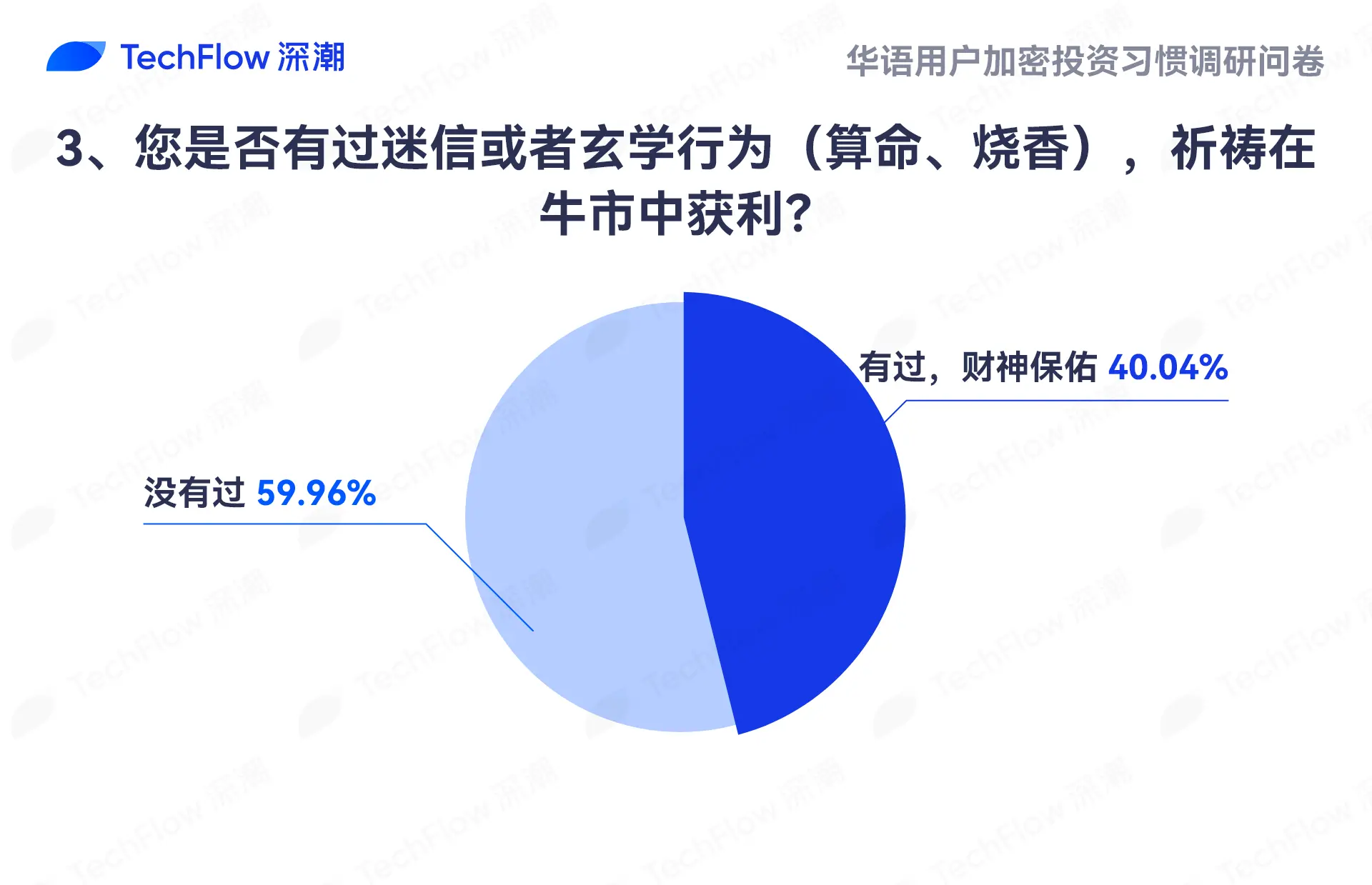 在玄学盛行的当下,有 40.04% 的受访投资者表示有过祈祷财神保佑等玄学行为。