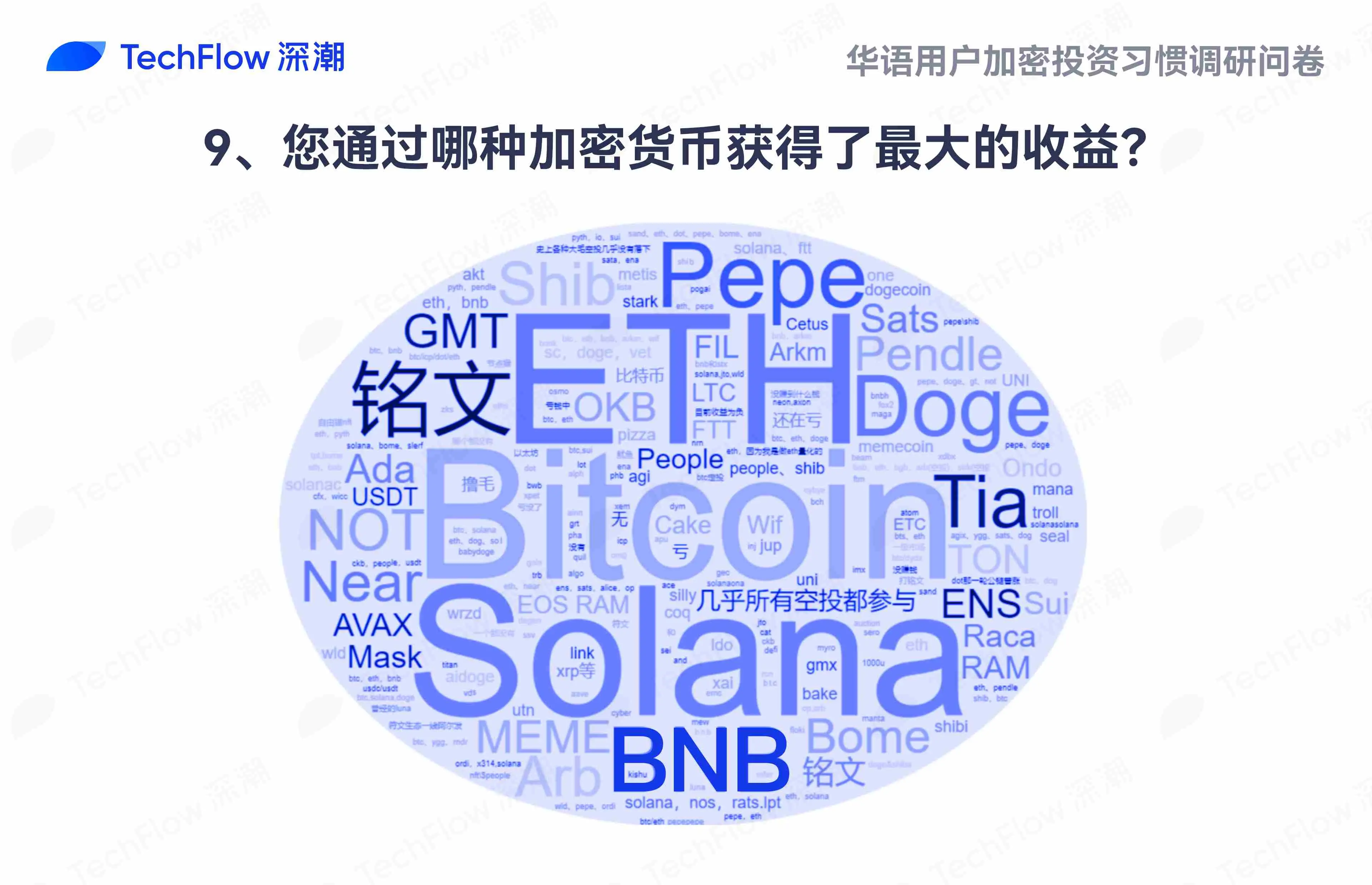 根据获得的结果,Bitcoin、ETH、Solana、BNB、PEPE 成为受访者提及最多的加密资产,这也反应了本轮周期行情的热点,大量山寨币走势不如主流币。