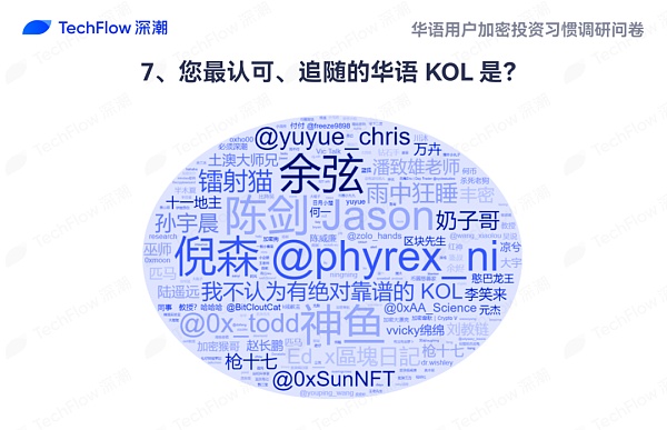 本次问卷调研中,我们对当前受访者最认可的加密 KOL 进行了数据收集,本题为非必答题,感兴趣的受访者可以填写提交,根据反馈中各 KOL 的提及频率,我们制作了词云展示。