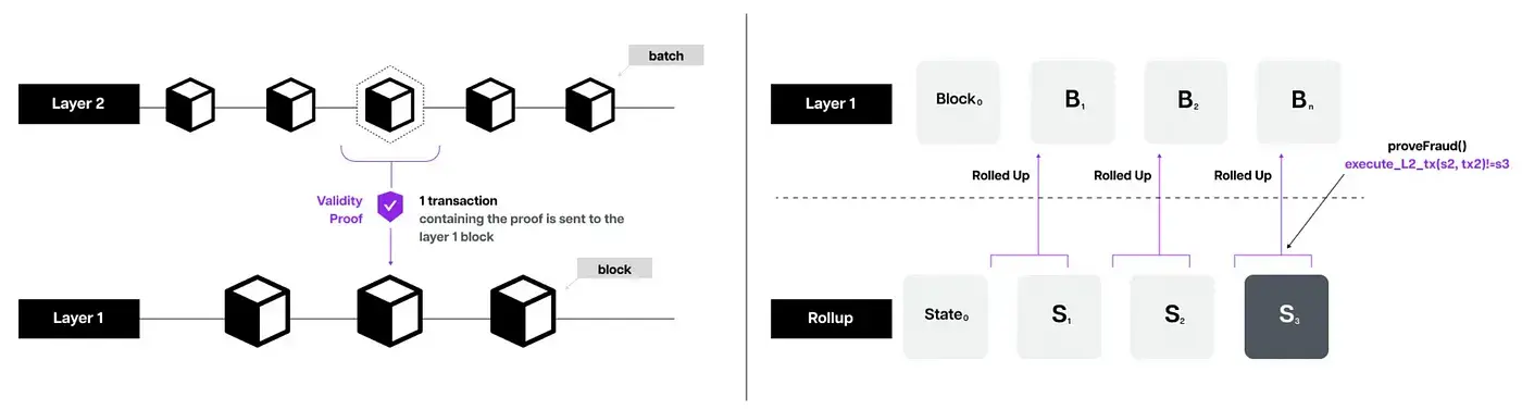 我们认为 rollups 是真正的 L2,因为每笔交易都有一个提交给 L1 的证明作为支持;这个证明可以直接在 L1 上进行验证。在 rollups 中,若干交易被 rollups 为1笔交易。然后,这笔交易连同有效性证明一起提交给L1。有效性证明表明:“嘿,我已经检查了这些交易,并且可以确认它们遵循所有规则。你可以检查我,并获得累积的确定性。你不需要逐个检查每一笔交易!”