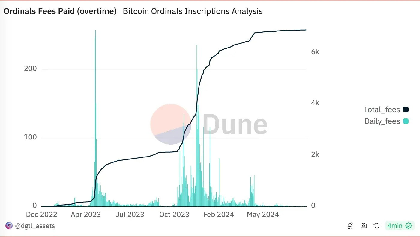 随着时间推移,创建比特币 Ordinals 的努力减少(来源:Dune Analytics)