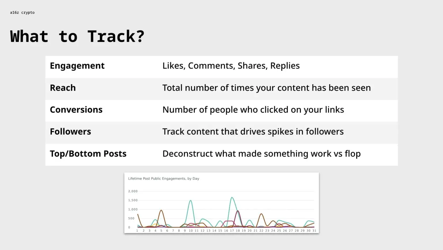 理解哪些内容推动了关注者数量的激增,比仅仅追踪总关注者数量更为重要。如果某种类型的帖子能够可靠地增加特定受众,这是一项非常有价值的信息。正如前面提到的,跟踪表现最佳和表现最差的帖子,并尝试理解是什么让某个帖子成功或失败,也是个好主意。