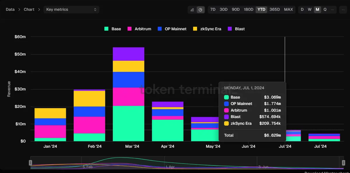在收益方面,自3月开始,Base网络每月捕获的收入就在Layer2市场中排名第一。其中7月Base网络整体的收入超过300万美元,而主流Layer2网络的整体收入才660万美元。