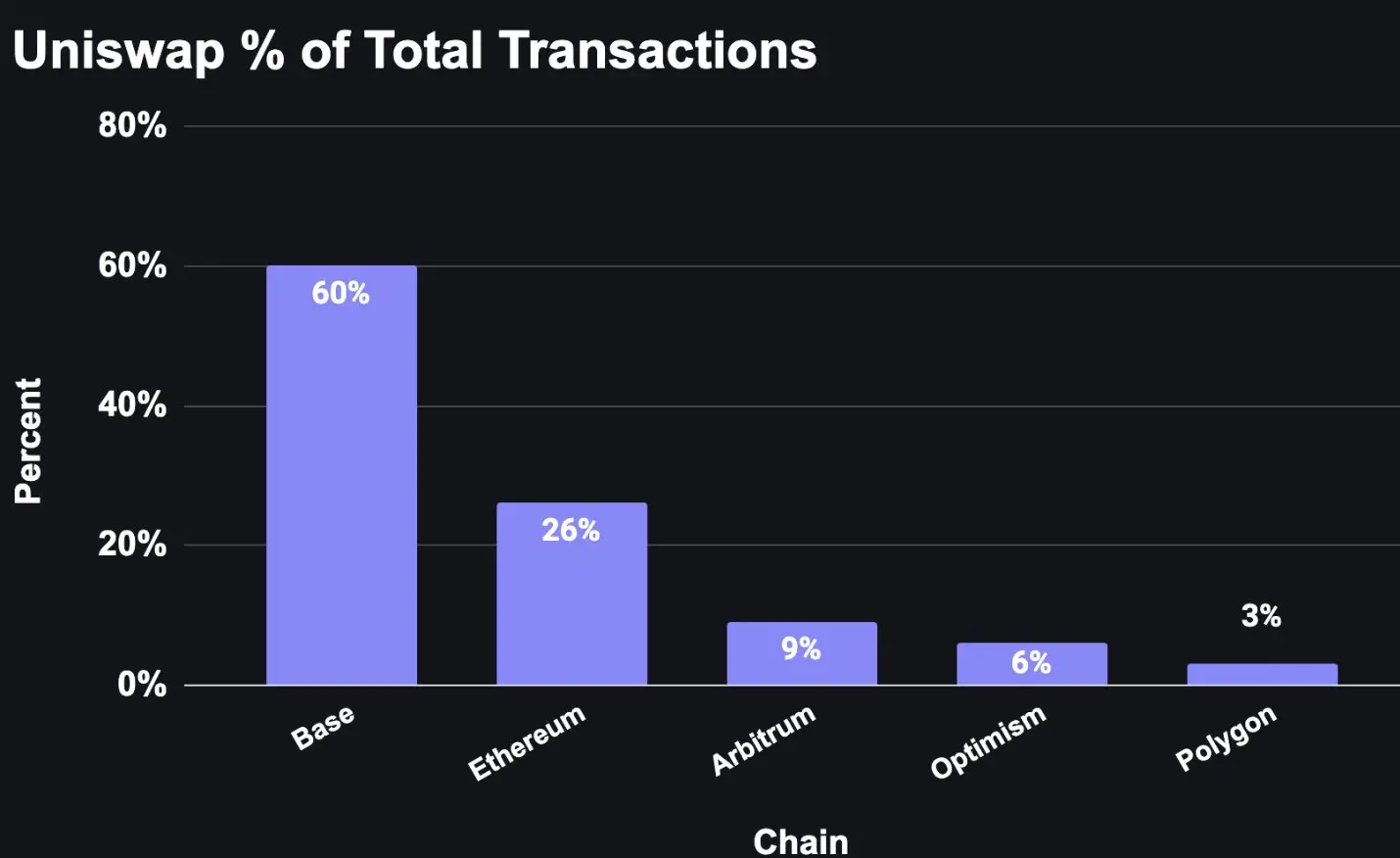 目前,全网第一大DEX平台Uniswap交易量的60%都发生在Base网络,同一期间内,以太坊网络贡献的交易量仅占比26%。而Base链的第一大原生DEX Aerodrome交易量在DEX赛道排名前六。