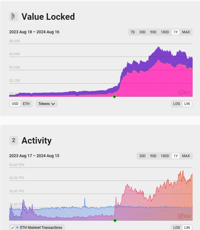 8月19日L2Beat数据显示,Base网络的TVL已有63亿美元,早已成为第二大Layer2网络,市场占有率升至17.2%,排名仅次于Arbitrum(147.5亿美元)。