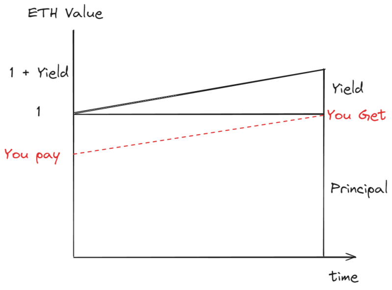 在普通池子中,用户需投入 0.95 ETH 来换取 1 PT-ETH,该过程保证了到期时用户能够以固定收益获得 0.05 ETH。而用户的额外收益,则来源于 YT 持有者所分享的基础流。