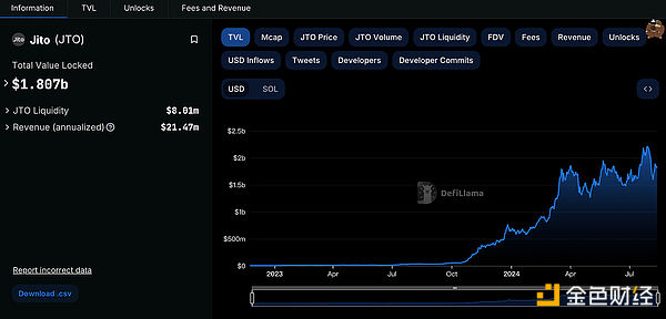 市场地位和收入:Jito 作为 Solana 网络的第一大协议,据 DefiLlama 数据,其 TVL 目前已达到 18.02 亿美元,协议年收入达 2147 万美元。这些显著的成绩巩固了 Jito 在 Solana 生态系统中的领先地位。虽然 Jito 的重质押服务尚未正式上线,但其发布的代码和计划已经引起了广泛关注,并为其未来在重质押赛道中的进一步发展奠定了基础。