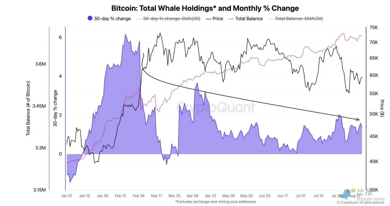 报告显示:「鲸鱼持有量的 30 天百分比变化已从 2 月份的 6%(自 2019 年 2 月以来的最快速度)下降至目前的 1%,从历史上看,鲸鱼持有量的月增长率超过 3% 就与比特币价格上涨有关,但目前情况并非如此。」
