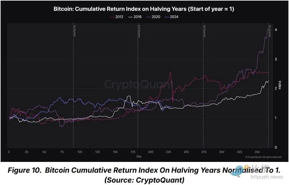他们表示:「这些模式表明,减半后的周期通常会出现大幅反弹,即使之前出现短期下跌。截至 2024 年减半年的第 230 天(8 月 17 日),年初至今的标准化回报率为 1.38(38%)。」