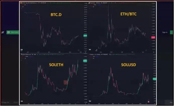 他介绍了与 Ledger 的讨论,并展示了四张图表:比特币主导率、 ETH / BTC 比率、 ETH / Solana 比率以及 Solana / USD 价格。他认为这些图表能反映市场的当前状态,旨在获取 Ledger 的解读。