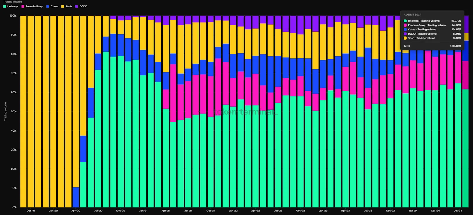 自 2020 年 5 月 V2 版本上线以来,Uniswap 在去中心化交易领域的市场份额经历了跌宕起伏的旅程。它曾一度在 2020 年 8 月攀至高峰,占据市场近 78.4% 的份额,却在 2021 年 11 月的 DEX 激烈竞争中跌至 36.8% 的低谷。然而,如同凤凰涅槃,它不仅重新站稳了脚跟,还以 61.7% 的市场份额宣告了自己的坚韧与不屈。