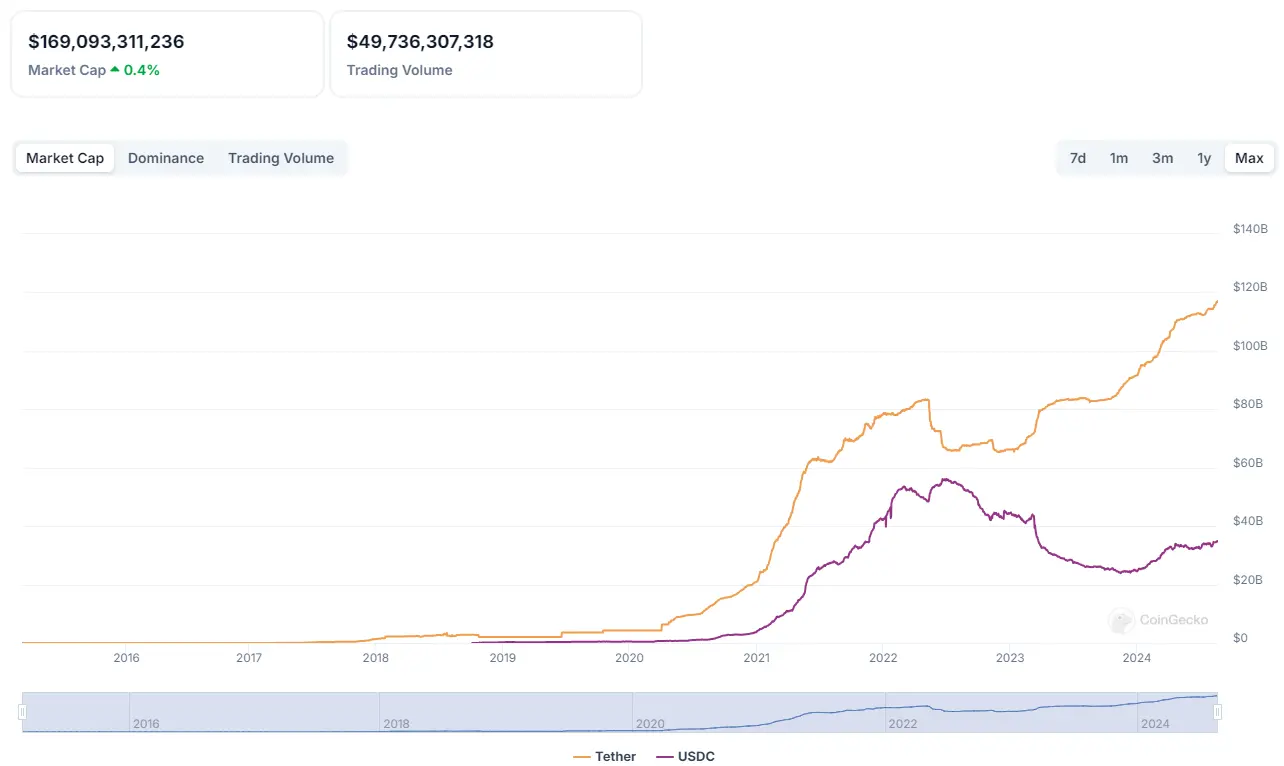 目前稳定币市值为$169B,在全球范围内获得了广泛关注和应用,逐渐从加密货币交易的狭义场景扩展为全球化支付的重要选择。