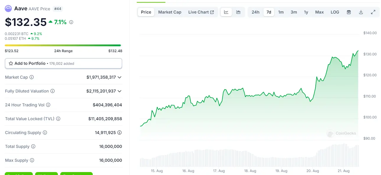 截止撰稿时,AAVE 代币价格超过 132 美金,过去 7 日涨幅超过 50%,已经达到了 3 月顶峰的水平。