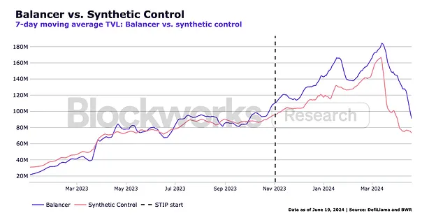 基本上,我们看到每花费 1 美元,TVL(总锁仓价值)从 2 美元到 24 美元不等,这听起来不错。然而,我们需要问一个真正的问题——其中有多少是被保留的?这就是变得有点棘手的地方。Balancer 的 TVL 在奖励结束后基本上下降,这在这个图表中显而易见: