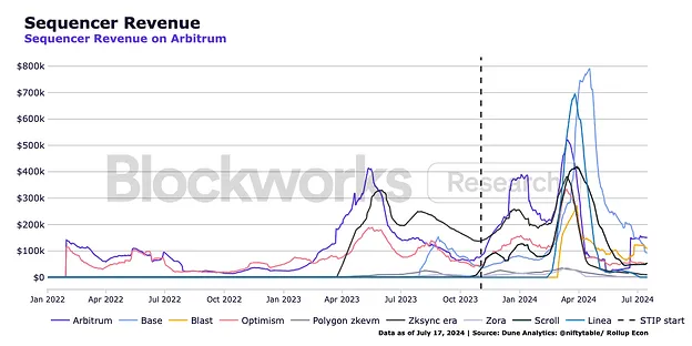 这是从 2022 年 1 月到 2024 年 7 月的排序器收入图表。在 4 月附近的大幅波动是加密货币开始大幅上涨的时候,合成控制帮助我们对此进行调整。