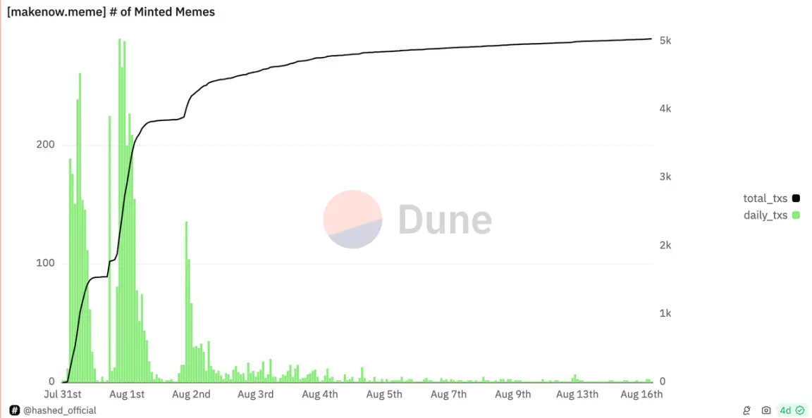 MakeNow.Meme 作为新的发行平台,虽然现在热度低迷,但刚推出时引发了极大热潮,一时间名人币纷纷爆发。其上一天发行了超 2600 个 Memecoin,收益超 230+ SOL。MakeNow.Meme 的发行机制相较于 Pump.fun 来说,不仅是对资产发行方式的再简化,也为做市模型提供了新的方向。