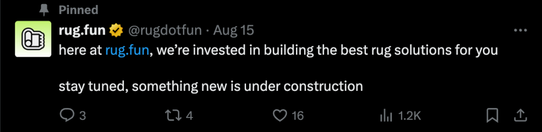 Rug.fun 来源于 Farcaster 生态,在玩法上相对有趣,类似赛马游戏。玩家需要猜对第 1 名和第 10 名才能获得高赔率回报。每轮游戏 12 小时,玩家可以创建代币或买入代币。最初玩家可以随意更换押注代币,而不收取额外费用。随着时间的累积,更换代币的费用增加。最终其他项目会将流动性加入第 1 名池子,实现价格的增长。目前官方推特账号在 2 个月未更新后,于 8 月 15 日发布公告宣布正在更新。