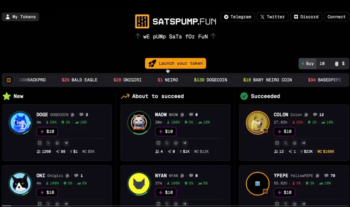 Satspump.fun 是比特币扩展网络 Fractal Bitcoin 上的 Memecoin 发行平台,目前该平台已与比特币生态链游基础设施 UniWorlds 达成合作。官方于 8 月 9 日宣布将进行一次 BRC-20 空投,凡在钱包中持有价值 300 美元的白名单 BRC-20 代币(ORDI、SATS、PIZZA、SHNT、WZRD、HONK、RATS)或 3 个位图的用户均有资格获得本次空投。目前 Fractal Bitcoin 主网还未上线,将于 9 月 1 日正式启动。