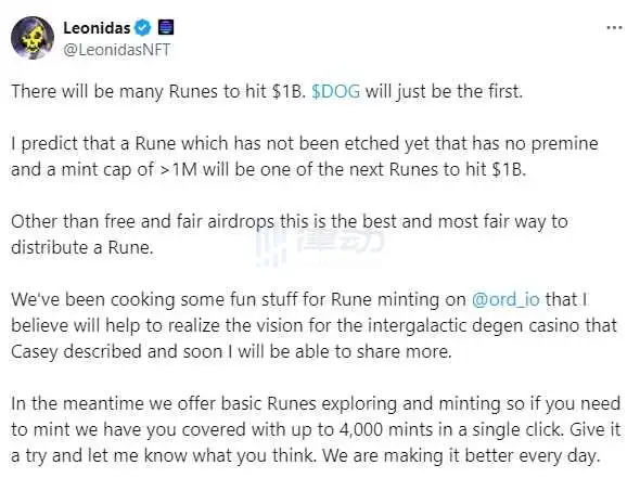 BlockBeats 消息,6 月 4 日,Ordinals 开发者、Runestone 发起人 Leonidas 在社交媒体发文表示,预测下一个市值超 10 亿符文应符合无预挖、尚未铭刻(etched)且铸造上限大于 100 万等条件。Leonidas 称,除了免费和公平的空投之外,这是分配符文的最好和最公平的方式。