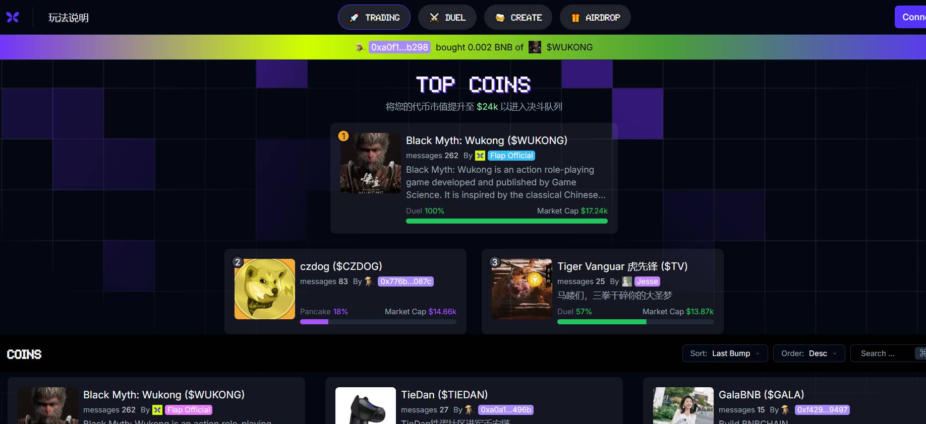 基于 BNBChain 的又一 Pump 平台,与今天大火的 Four.Meme 同属一个性质,玩法没有本质上区别。从截图上的首页热点币种可以看出,Flap 已经承接了一部分 BNBChain 上的注意力。