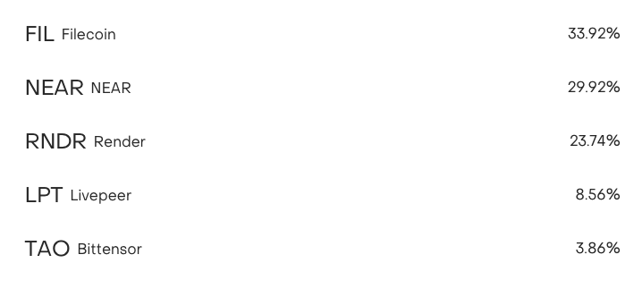 Grayscale 去中心化 AI 基金是首个仅投资于去中心化 AI 协议原生代币的基金。目前该基金包括 Filecoin、Near、Render、Livepeer 和 Bittensor。