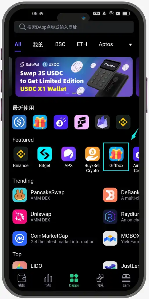 打开 SafePal App,找到 DApps 应用商店,点击 Giftbox, 或者直接点击活动海报