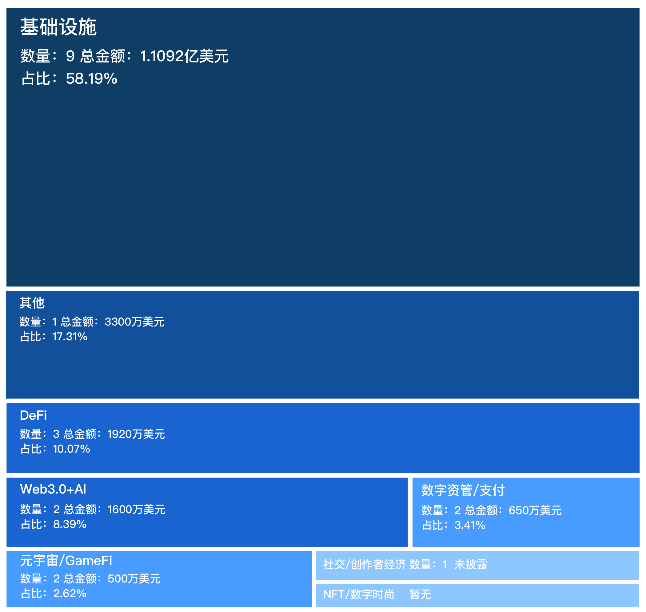 据 BlockBeats 统计,上周的融资总数为 20 笔,数量较之前增多,总金额约为 1.9062 亿美元,平均融资金额为 953.1 万美元。其中,基础设施领域占据主体,其他领域融资相对较多,DeFi 领域和 Web3.0+AI 领域增多,数字资管/支付领域、元宇宙/GameFi 领域和社交/创作者经济领域较少,NFT/数字时尚领域暂无。下图为上周各板块融资占比: