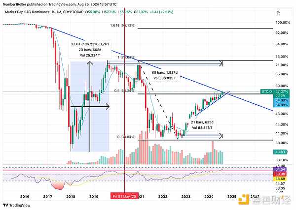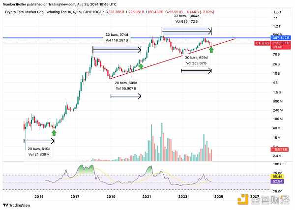 BTC 主导月线图正好处于宏观阻力位。距离主要低点也恰好是 21 个月,距离 2019 年高点是 60 个月,在 20 个月的运行后也达到了顶峰。毫无疑问,这是值得关注的,因为山寨币也在各自的周期中达到关键的拐点。