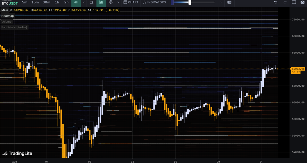 观察筹码分布图,在约 63000 附近有大量筹码成交,将有⼀定的支撑或压力。