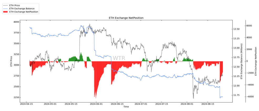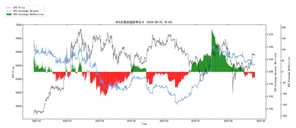 4. 交易所净头寸整体呈现 BTC 流入累积,ETH 中量流出。