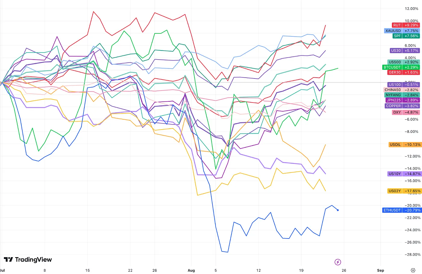 3 季度以来,表现较好的资产:RUT(罗素 2000 指数)和 XAUUSD(金价)还有 SPF(金融股)以及美债,表现较差的资产:以太坊、原油、美元。几乎走平的大饼,纳斯达克 100。