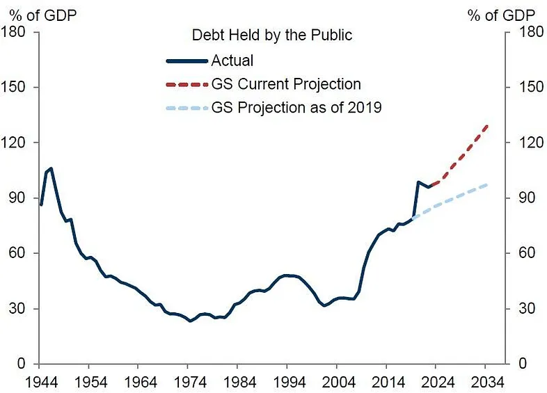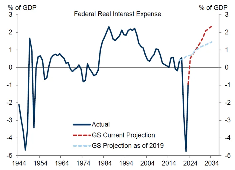 持续关注美国的财政状况,基本上每年都会作为主题炒作一次,如下图所示,美国政府的债务十年之内就可能达到 GDP 的 130%,且光利息支出就将达到 GDP 的 2.4%,维持美国全球霸权的军费支出才 3.5%,这显然不可持续。
