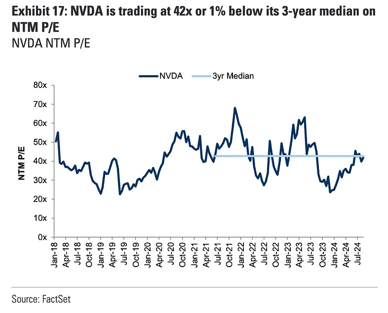 NVDA 当前的估值水平基本位于过去三年中值水平,不高不低。